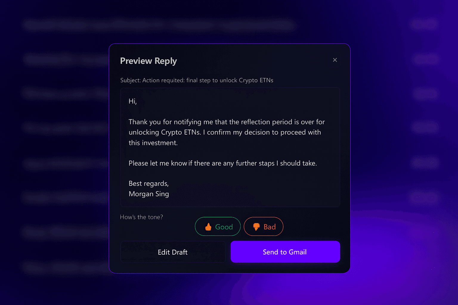 See the draft, hit send, or guide it with a quick tweak. No copy-pasting, no switching tabs, just smooth control.